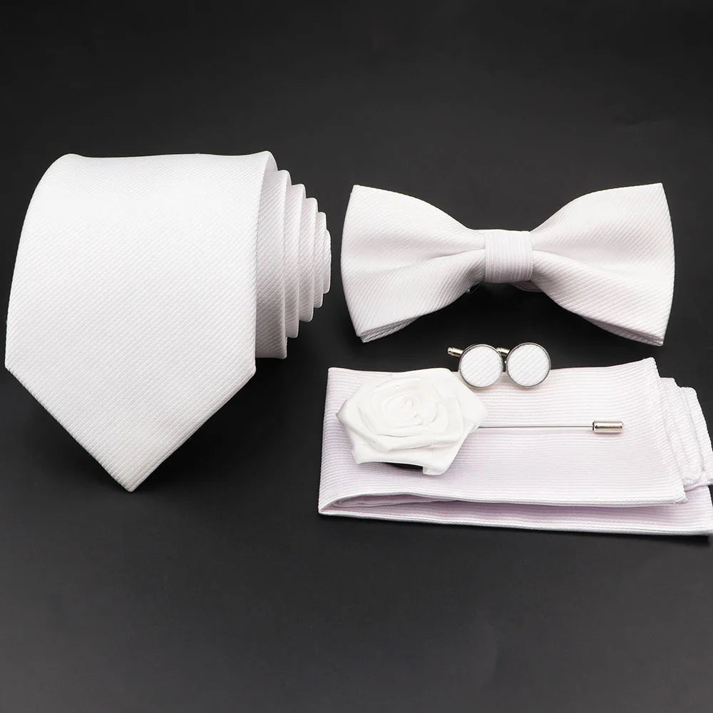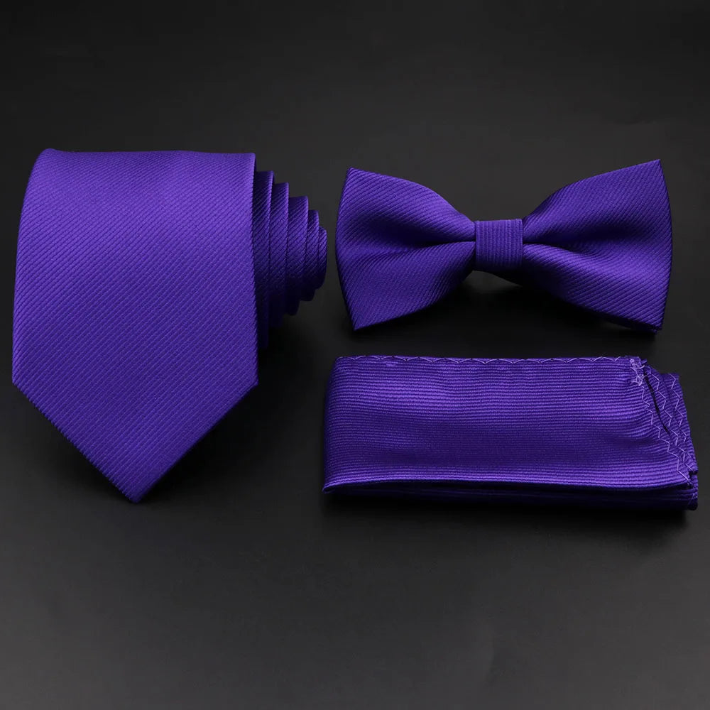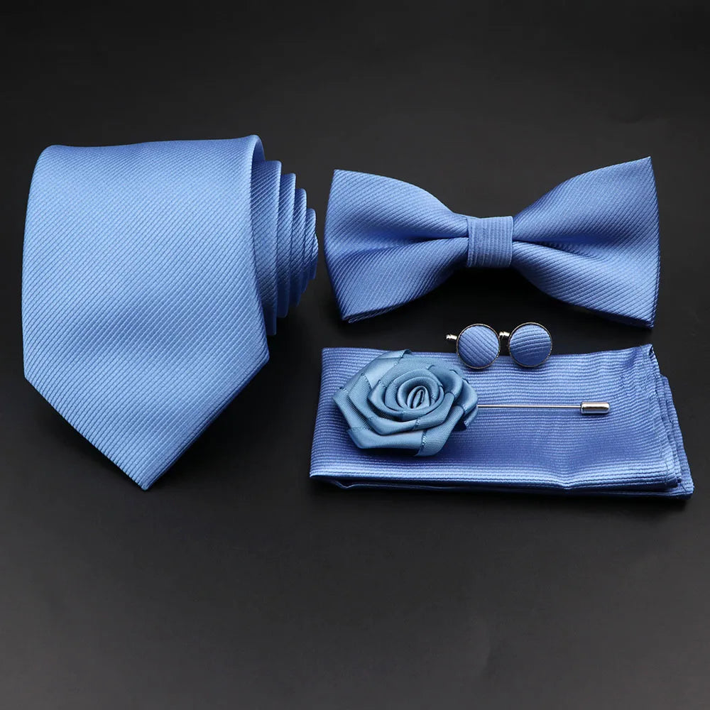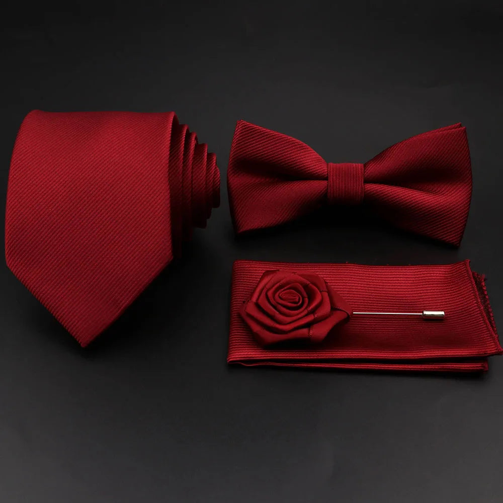 Hot Sale Red Blue Tie Set Polyester Slim Striped Necktie Bowtie Cufflink Brooch For Groom Suit Wedding Cravat Shirt Accessory